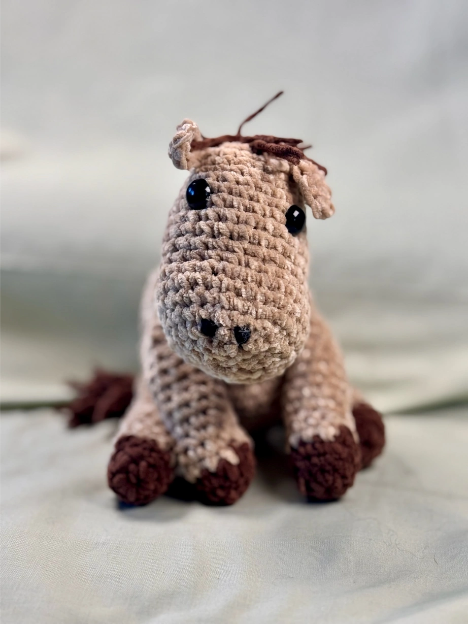 Meet this sweet and cuddly Handmade Light Brown Horse Plushie, crafted with super-soft chenille-style yarn for a plush, gentle feel. This charming amigurumi horse features a warm tan body, dark brown hooves, floppy limbs, and a cute yarn mane and tail that add personality to every angle.