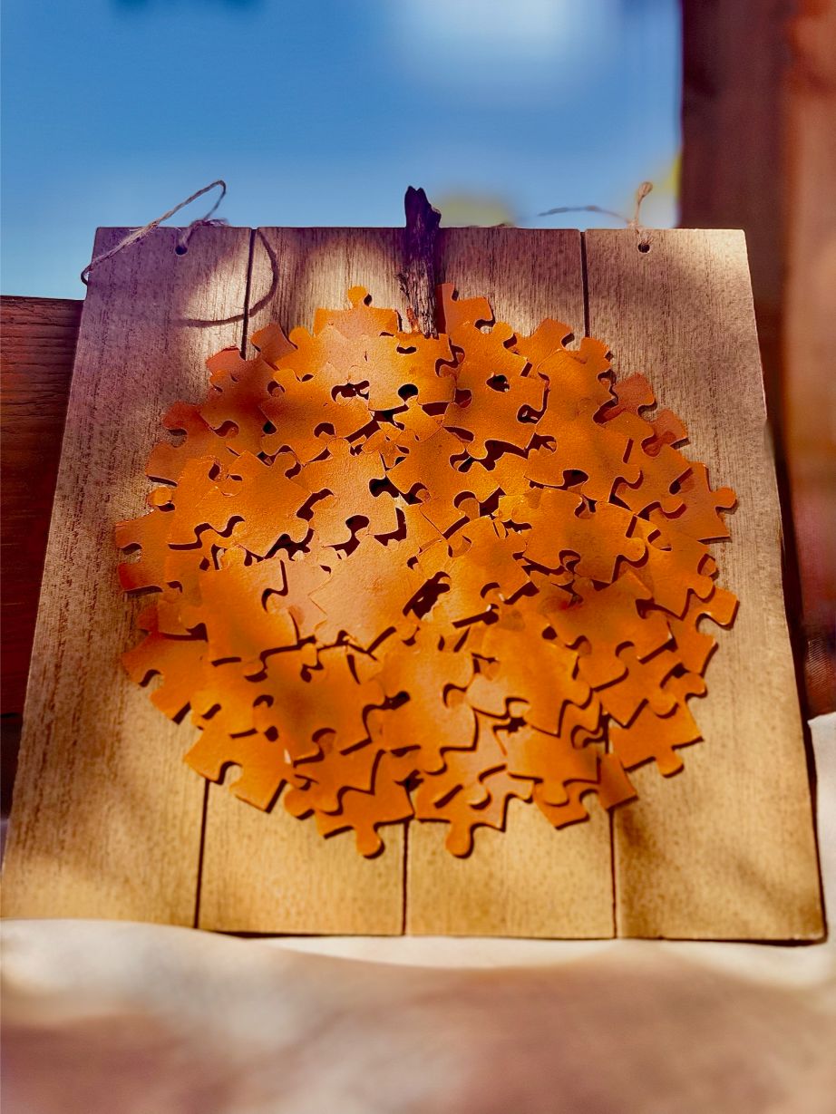 Celebrate the creativity of the season with this handcrafted “Puzzle Piece Pumpkin” wall art. Made by arranging and painting puzzle pieces into the shape of a pumpkin, this design brings a fun and artistic twist to traditional fall decor.
