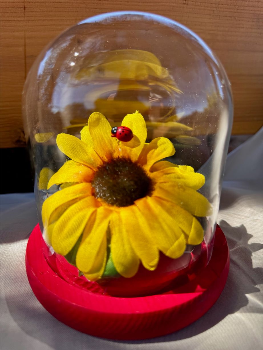 Bring a touch of nature indoors with this handmade sunflower and ladybug dome. Featuring a bright yellow sunflower encased in a clear glass dome with a bold red base, this piece captures the joy of summer in a timeless decorative keepsake.