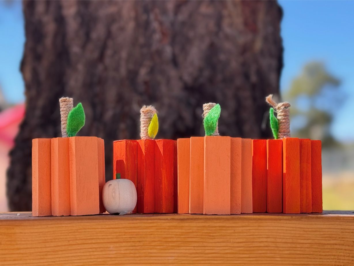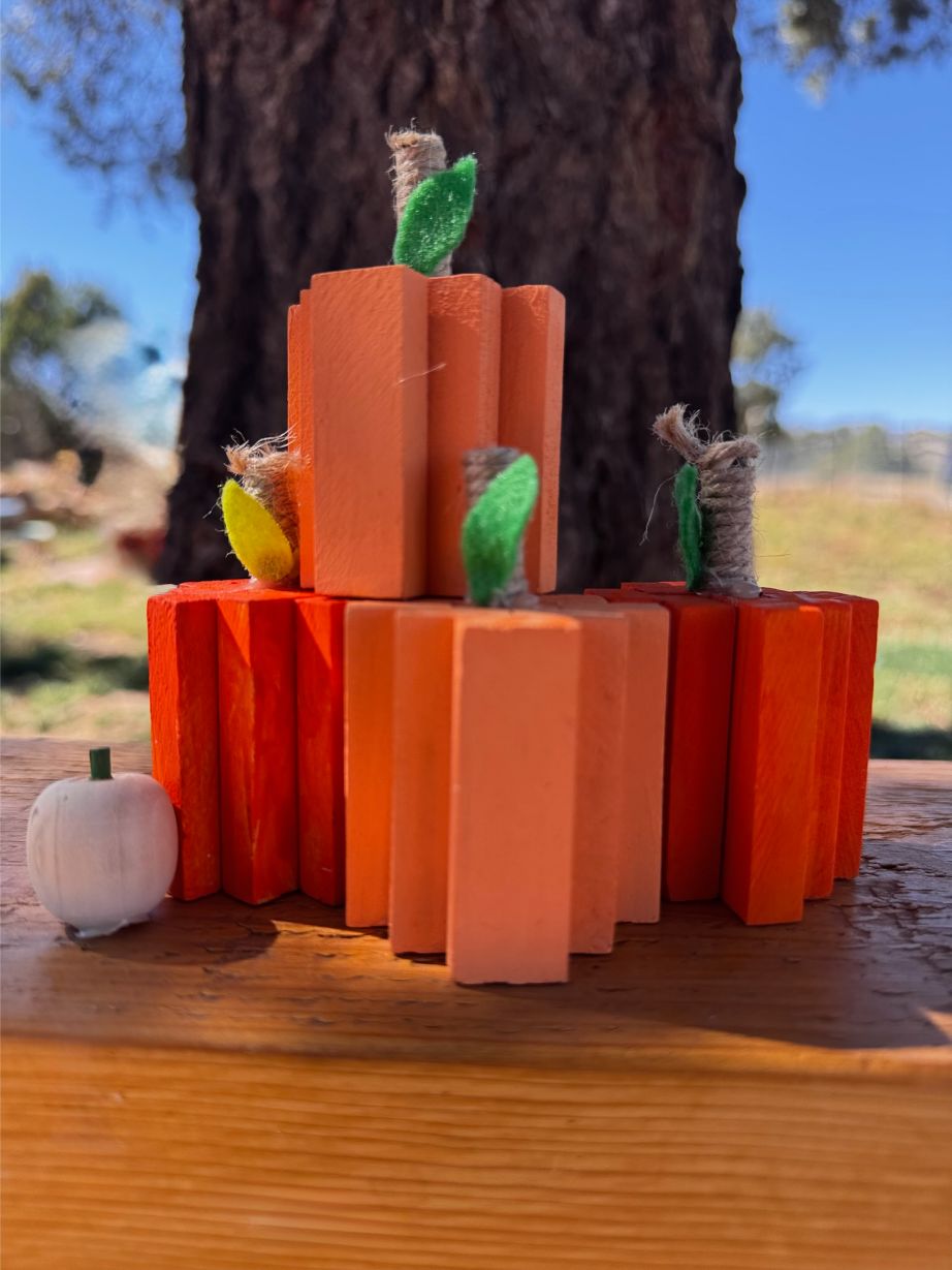 A set of handcrafted wooden block pumpkins with twine stems and felt leaves. Perfect for farmhouse-style fall decorating or cozy autumn displays.